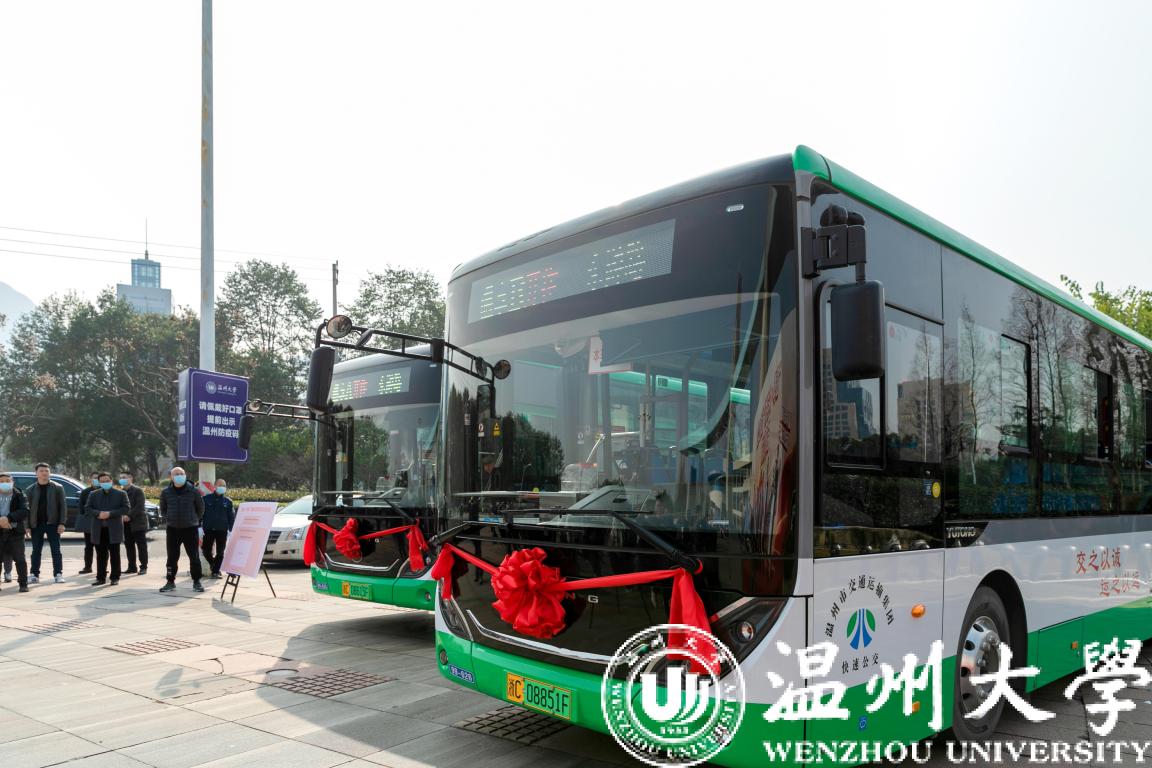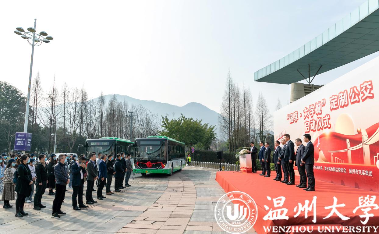 2月27日,“温享·大学城”定制公交启动仪式在香蕉视频 举行。温州市副市长陈宽、商务局局长彭魏滨、交运集团董事长朱祖荣、校党委书记谢树华、副书记庄兴忠等领导出席活动。