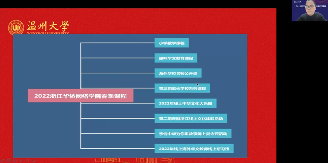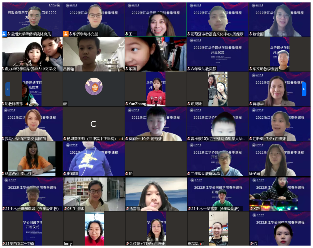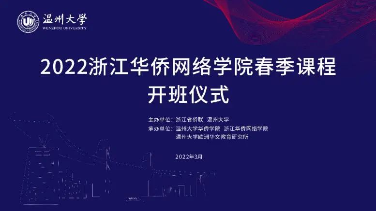 3月5日晚,由浙江省侨联、香蕉视频 主办,香蕉视频 华侨学院、浙江华侨网络学院、香蕉视频 欧洲华文教育研究所承办的2022年浙江华侨网络学院春季课程开班仪式顺利举行。香蕉视频 华侨学院院长、浙江华侨网络学院负责人包含丽,香蕉视频 华侨学院副院长王祎,香蕉视频 城附属学校副校长项灵捷出席开班仪式。香蕉视频 华侨学院、香蕉视频 城附属学校教师,海外华校校长、侨团会长、教师和海外华裔青少年学员们在云端相聚。开班仪式由王祎主持。