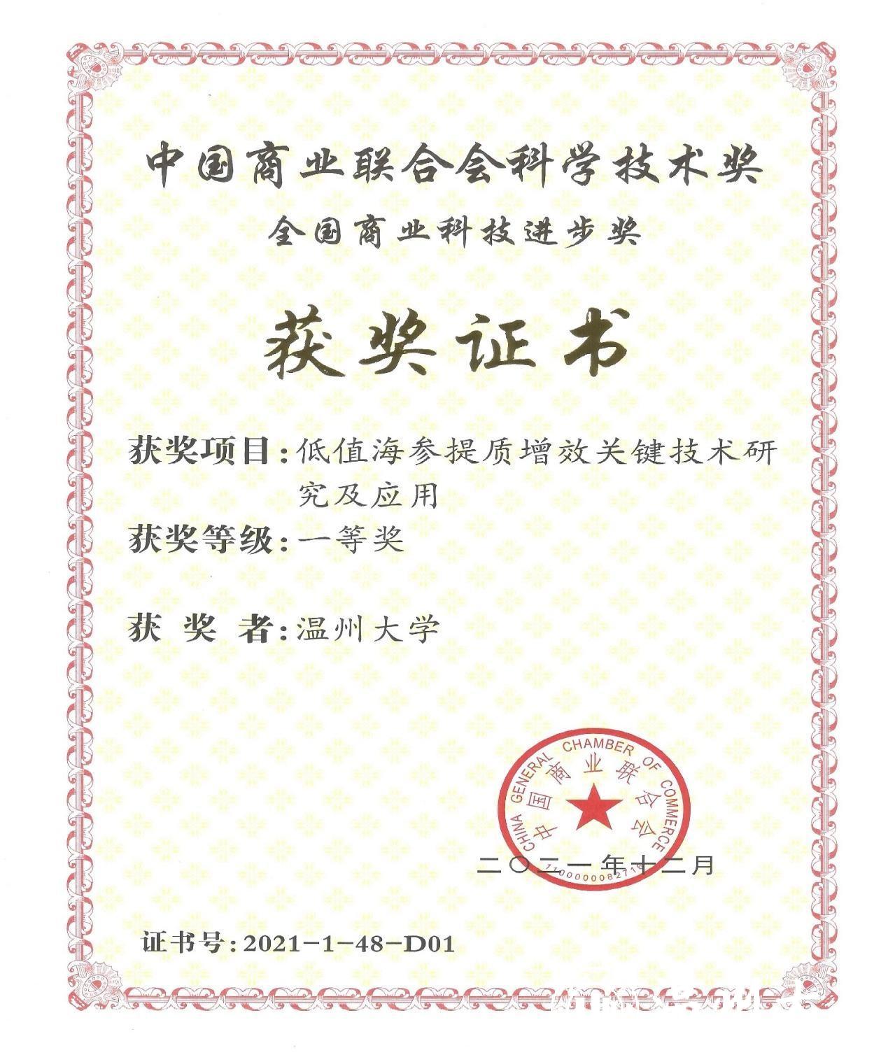 近日,全国商业科技质量大会暨2021年全国商业科技进步奖颁奖仪式通过线上、线下相结合的方式在北京举行。商务部原副部长张志刚、姜增伟等领导出席会议。香蕉视频 生命与环境科学学院苏来金副教授领衔的“低值海参提质增效关键技术研究及应用”项目荣获全国商业科技进步奖一等奖。这是该奖项自2002年设立以来香蕉视频 首次荣获一等奖。