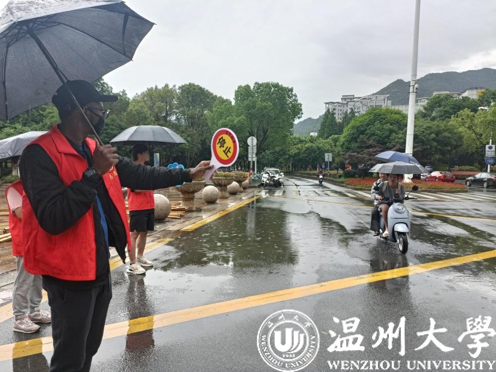 14点30分左右,“洋劝导”们与香蕉视频 外国语学院志愿者自行搭配组队,穿上红马甲,手持表示“通行”和“禁止通行”的指挥牌及交通安全宣传牌“上岗”了。瓢泼大雨没有浇熄热情,发现非机动车存在“不戴头盔”“乱闯马路”“带人”等不规范行为时,他们便举起宣传牌示意车辆靠边停下,及时劝导告知交通安全小贴士,并张贴提前准备好印有“只戴头盔不带人、各行其道不‘霸道’”的温馨提示贴,提高文明出行意识。违规者还被要求担任“交通督导员”,与外国留学生、志愿者一起管理交通秩序5分钟,体验交通“督导员”的工作。