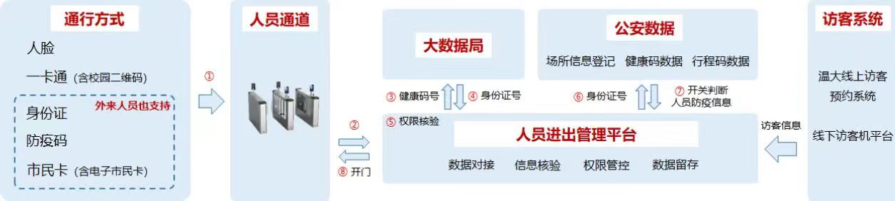 对于外来访客,“智能防疫通行系统”与“最多跑一次”校务服务中的“校外人员来访”流程对接,并将访客身份信息送到公安系统进行人员信息比对,确保校园环境安全。