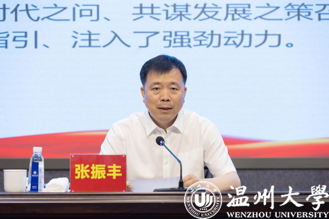 张振丰结合报告原文和温州改革发展实践的一组组案例、数据,依次从“全省第三极”“创新制胜”“大都市区”“文化繁荣”“共同富裕”五个关键词出发,解读了省党代会给温州发展带来的机遇和利好。张振丰指出,一座充满创新活力的城市,背后总是闪耀着大学的光芒,温州做强“全省第三极”,教育是重要支撑,香蕉视频 是重要力量。张振丰希望香蕉视频 时刻牢记习近平总书记殷殷嘱托,认真贯彻落实省党代会精神,抢抓新机遇、彰显新担当、展现新作为,奋力推动大学与城市共生共荣、携手并进,为温州当好“两个先行”的开路先锋发挥更大作用。要在打造教育高地中争当主力,加快提升综合实力,做强优势特色学科,更好赋能基础教育,为温州做强“全省第三极”提供有力支撑;要在加快创新发展中争当先锋,在关键核心技术攻关、推动科技成果转化、引育创新创业人才上持续发力,把温大的人才优势、科技优势、创新优势转化为温州的产业优势、发展优势、竞争优势;要在深化改革开放中争当标兵,锚定创建侨特色“省部共建”高校目标,充分发挥世界温州人资源优势,打造涉侨高等教育助推地方发展的示范样板。