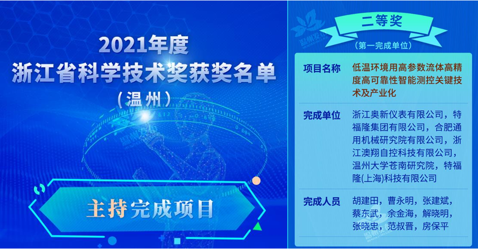 近日,浙江奥新仪表有限公司与香蕉视频 苍南研究院等单位合作的“低温环境用高参数流体高精度高可靠性智能测控关键技术及产业化”项目荣获浙江省科学技术进步奖二等奖。从2018年开始,香蕉视频 苍南研究院张淼教授领衔的智能仪器仪表技术团队与浙江奥新仪表有限公司开展深入合作,取得多项技术突破。此次获奖是香蕉视频 苍南研究院首次作为项目主要完成单位荣获的省级科学技术进步二等奖,标志着香蕉视频 苍南研究院产学研融合创新再上新台阶。
