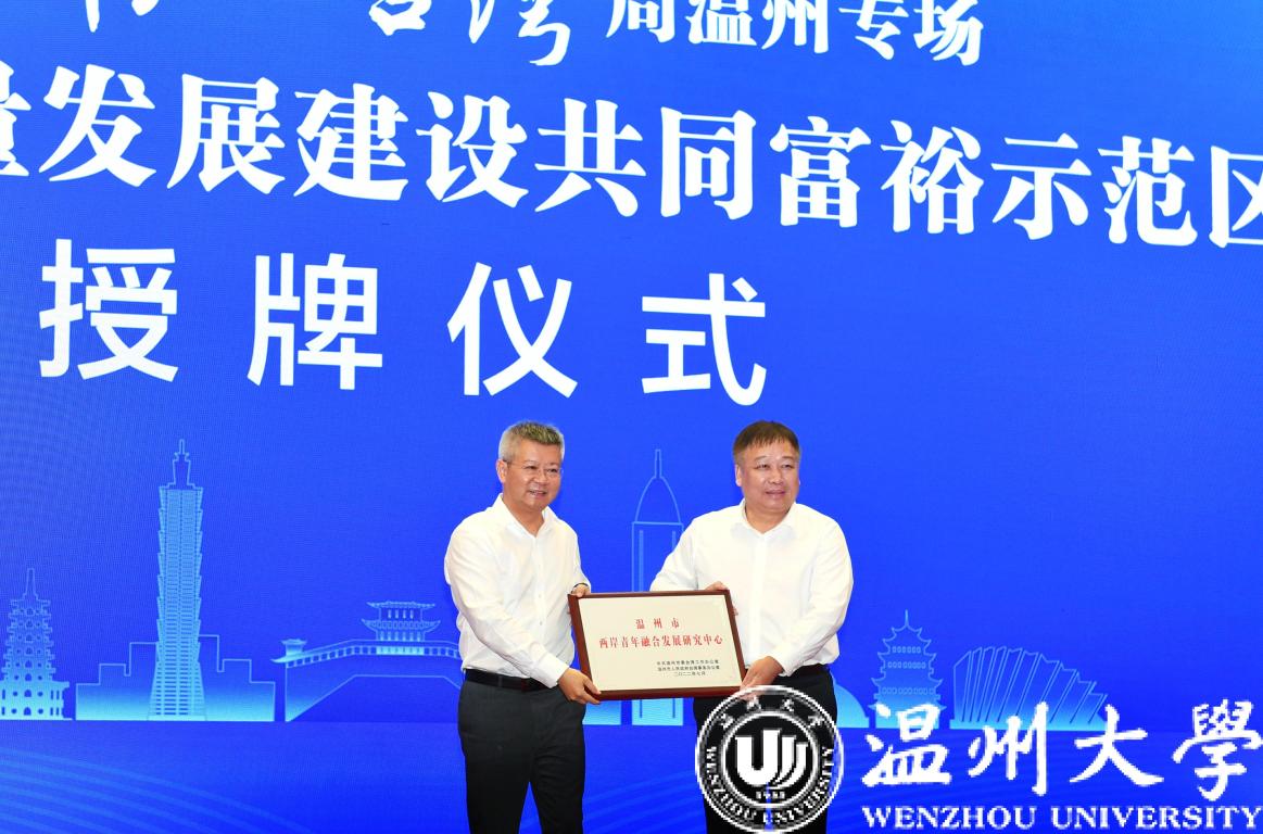 在“筑梦温州”海峡青年创新创业季启动仪式上,大会为香蕉视频 两岸青年融合发展研究中心授牌,校长赵敏校长从温州市委常委、统战部部长汪驰手中接牌。