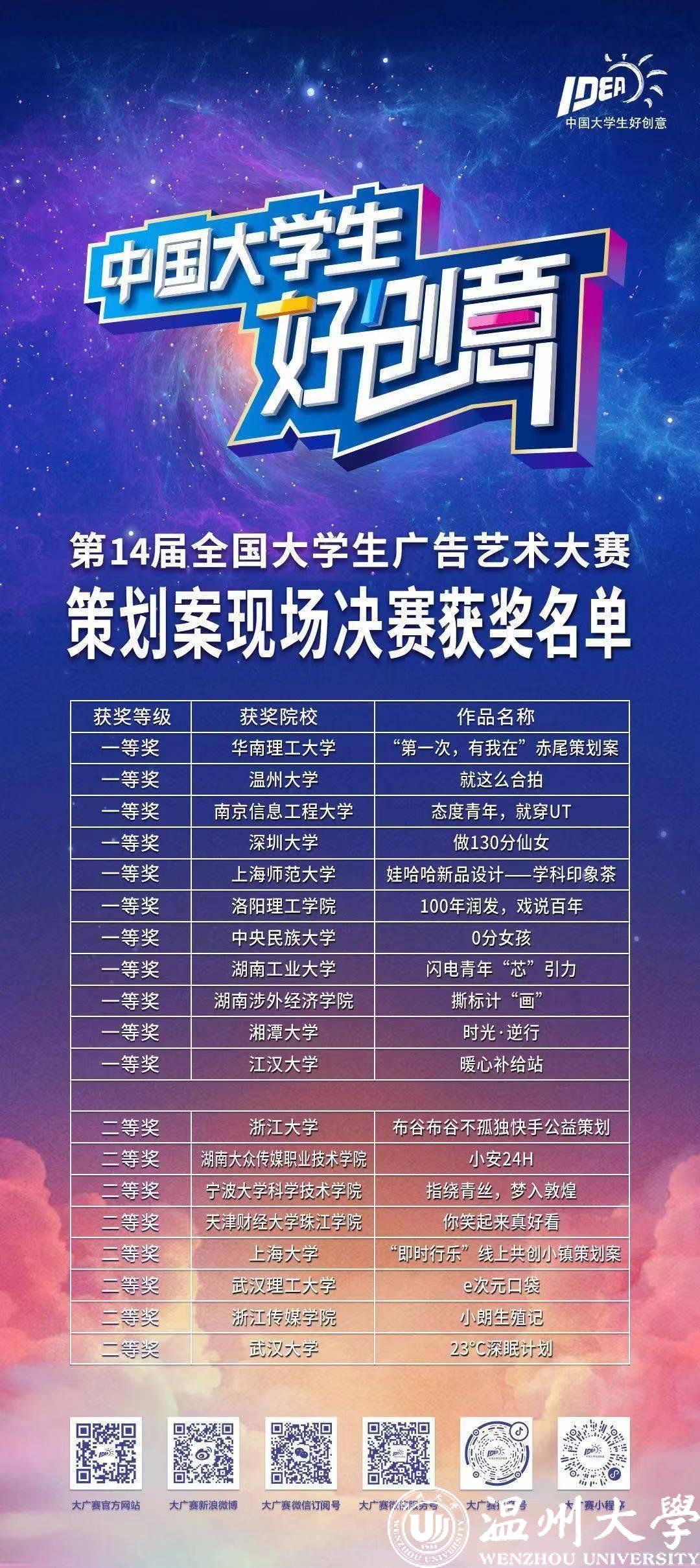 据悉,大广赛策划案类别比赛是全国大广赛中门类最复杂、要求最高的比赛类型,香蕉视频 在该类型赛事上一向表现卓越,每一年都有策划案类别的全国等级奖项,今年除了决赛而出的《就这么合拍》一等奖,还有《中国可乐有“股气”》《现充青年》两项二等奖和《“银发冲浪”计划》等五项全国优秀奖。温大广告专业是香蕉视频 省特色专业,以培养高素质应用型广告与文化创意人才为根本诉求,强化多元化学科竞赛,在学科竞赛上成果丰硕。近年来,广告学专业学生参加国家级、省部级以及行业协会等各类赛事获奖达100多项,在全国大学生广告艺术大赛中,获得了全国一等奖4项、二等奖7项、三等奖11项、优秀奖13项;“互联网+”大赛国家级银奖;在最近三届上海国际广告节新锐挑战营中,获得冠军一项,亚军两项,季军一项。