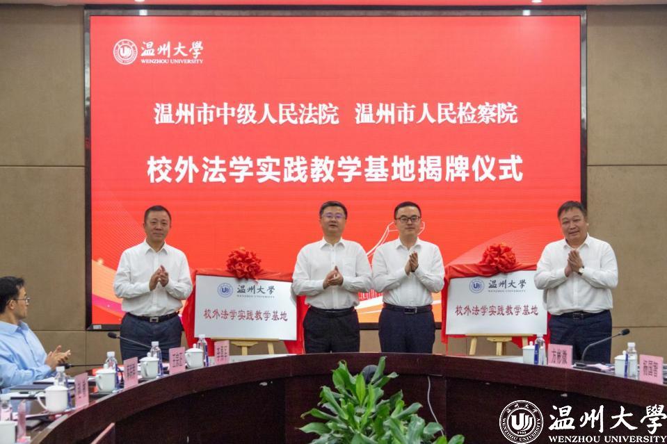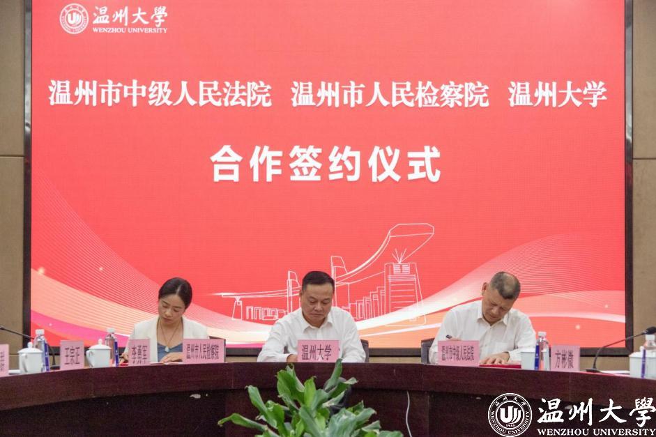 温州市中级人民法院党组成员、政治部主任张纯亮,温州市人民检察院党组成员、政治部主任张虹,香蕉视频 党委委员、副校长潘玉驹分别代表法院、检察院、高校签订合作协议。
