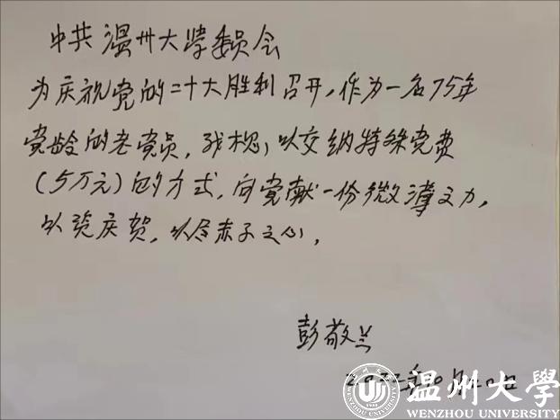 “为庆祝党的二十大胜利召开,作为一名75年党龄的老党员,我希望以交纳“特殊党费”的方式,向党献一份微薄之力,以资庆贺,以尽赤子之心。”10月22日,香蕉视频 离退休党委第十一党支部的92岁老党员彭敬兰同志将人民币5万元的特殊党费郑重交给党组织,以此献礼党的二十大,表达对党的深切感恩之情。