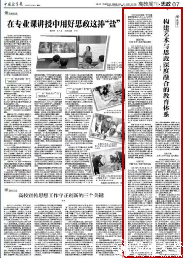 首创艺术思政大课深入人心。学校在2022年新生开学典礼上创新开讲艺术思政大课,将流光溢彩的舞台变成思政课讲台,将丰富多彩的文艺节目化成红色教材,聚焦“温大·梦起航”“瓯越·忆乡情”“华夏·铸辉煌”3个篇章,厚植爱党、爱国、爱乡、爱校之情。艺术思政大课线上线下同步举行,家长、校友、师生和社会各界共计46万人同上一堂思政大课。课程内容依托全校各学院学科专业全面选拔编排,加上高规格的专业展演团队、业务能力突出的指导教师和编排教师,“教”“演”结合、教学相长,建立起自编、自导、自育的“课堂+舞台”模式,以艺术之美点亮思政之光。