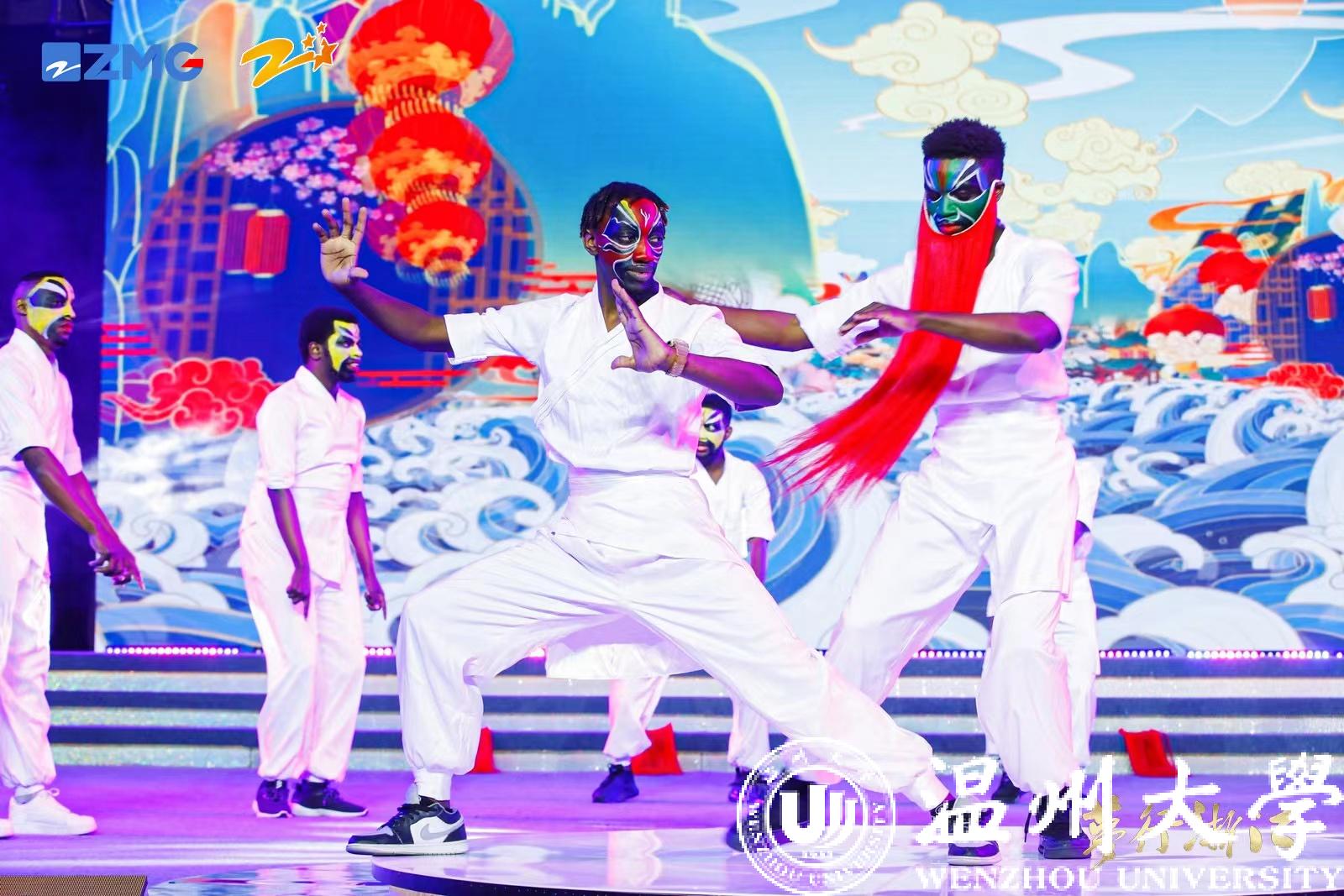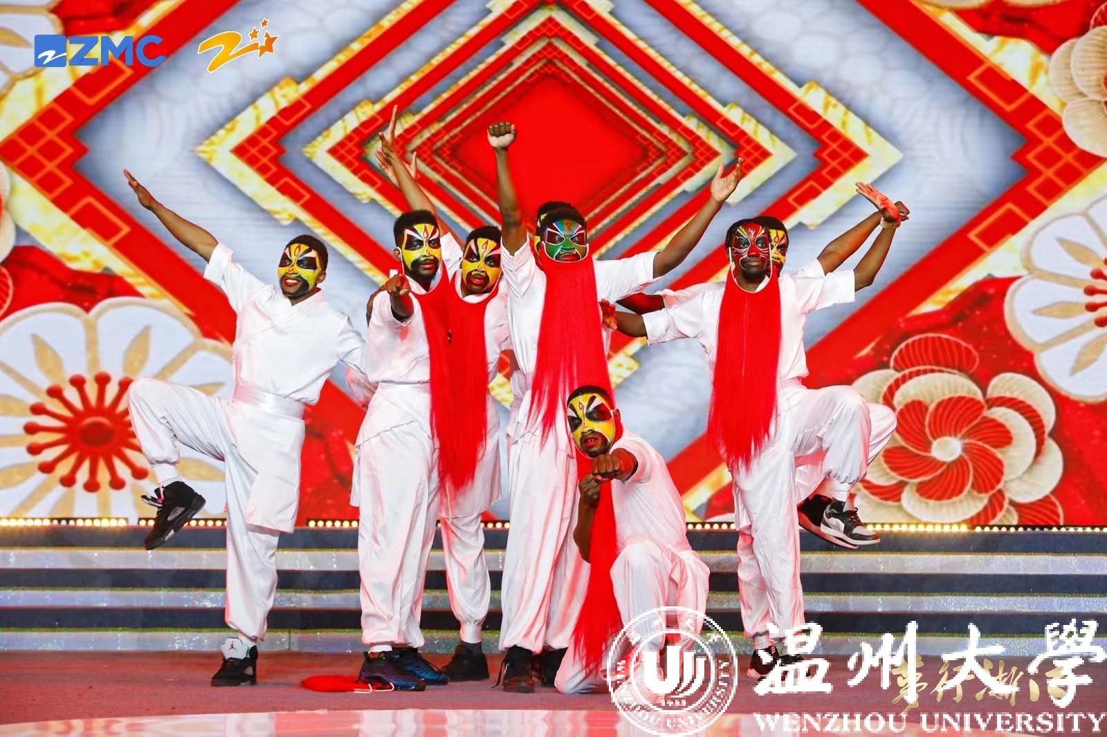 来自赞比亚、津巴布韦与尼日利亚等国家的8名外国留学生代表香蕉视频 ,经过了三个月的刻苦训练,倾情演绎了京韵街舞《京舞门》,诠释了现代与传统,中国文化与外国文化碰撞、交流、融合产生的独特魅力。表达了留学生们积极做“民间使者”,推进中外文化交流的责任、担当,得到评委们和观众们的一致好评。