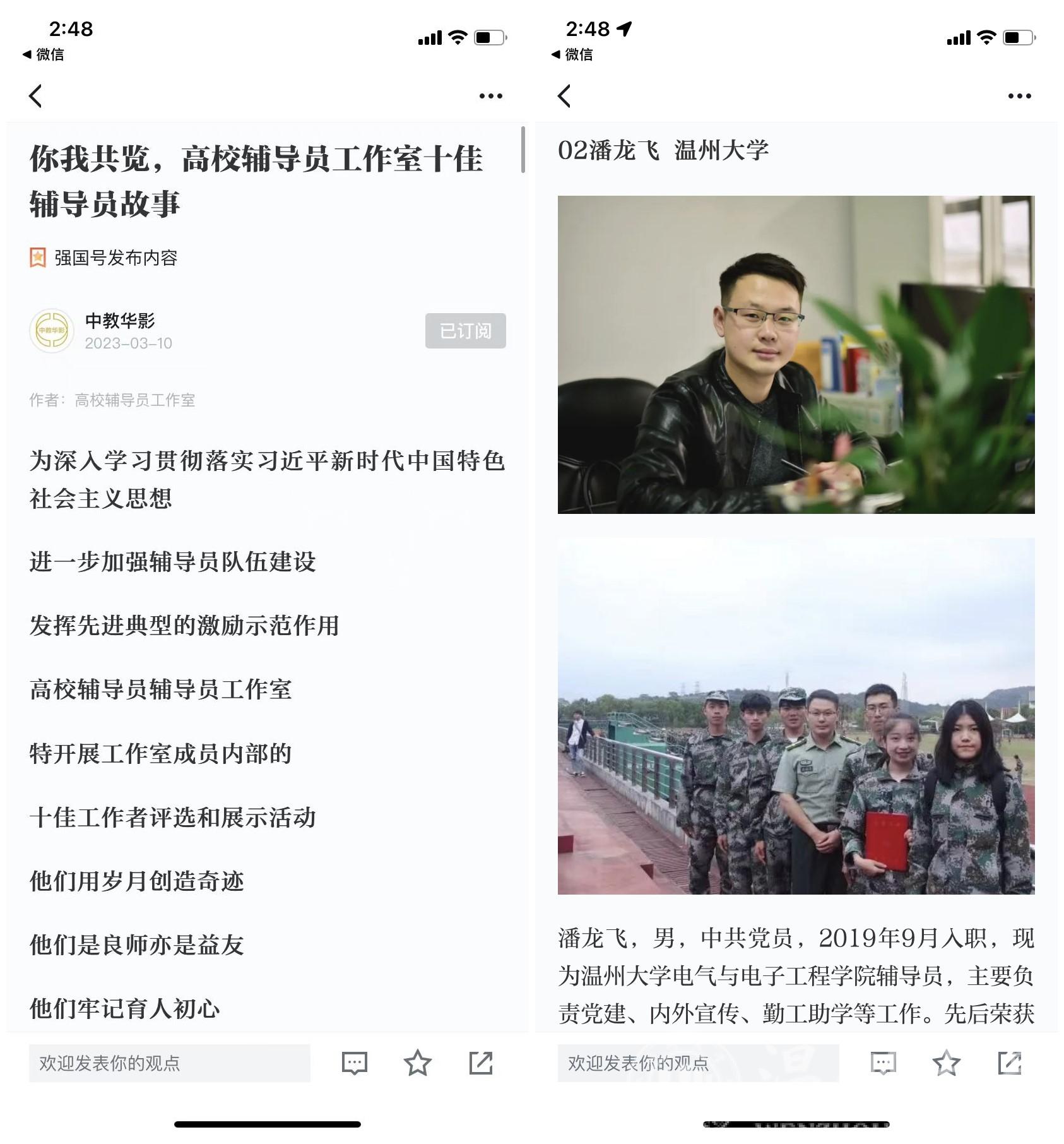3月10日,学习强国刊发了一篇名为《你我共览,高校辅导员工作室十佳辅导员故事》的文章,该篇文章系全国高校辅导员工作室,为深入学习贯彻落实习近平新时代中国特色社会主义思想,进一步加强辅导员队伍建设,发挥先进典型的激励示范作用,进行的十佳工作者评选和展示活动,香蕉视频 电气与电子工程学院辅导员潘龙飞也在其中。