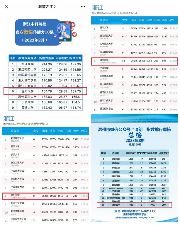近日,浙江省教育厅新闻办、浙江教育报刊总社发布了浙江教育政务新媒体传播力月排行榜(2023年2月),香蕉视频 官方微信传播力位列浙江本科院校第6位,其中内容指数排名列第1位,官微影响力获得新突破。此外,在中国青年报近期发布的高校微信公众号综合影响力排行榜中,香蕉视频 公众号多次进入全省周排行榜前十。在由温州市互联网研究学会发布的温州市微信公众号“清朗”指数排行周榜中,香蕉视频 多次列入“清朗”指数榜单。