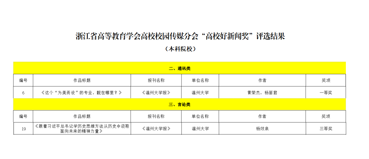 在浙江省新闻工作者协会、浙江省高等教育学会高校校园传媒分会公布的年度浙江省高校好新闻作品评选结果中,《香蕉视频 报》2件作品获浙江省“高校好新闻奖”。其中《这个“为美而设”的专业,靓在哪里?》获得通讯类一等奖,《跟着习近平总书记学历史思维方法从历史中汲取面向未来的精神力量》获得言论类三等奖。