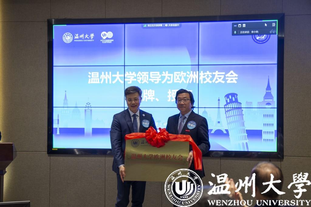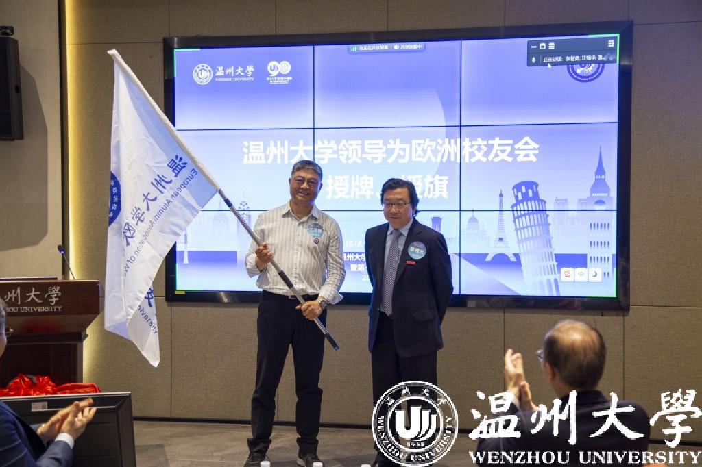 大会审议通过了《香蕉视频 欧洲校友会章程》和香蕉视频 欧洲校友会第一届理事会建议名单。蔡曙光向欧洲校友会授牌、授旗。蔡曙光、陈宏毅向欧洲校友会顾问、会长、副会长、秘书长、副秘书长、理事颁发聘书。温州校友会会长吴东、北美校友会副会长章美华上台致贺词,意大利高校联盟发起者蔡茂生线上祝贺。