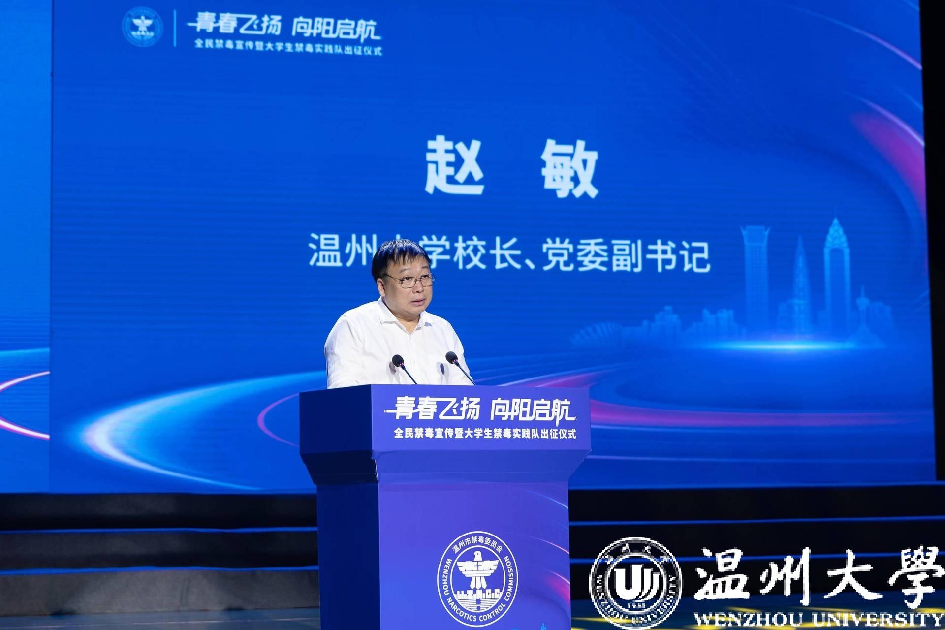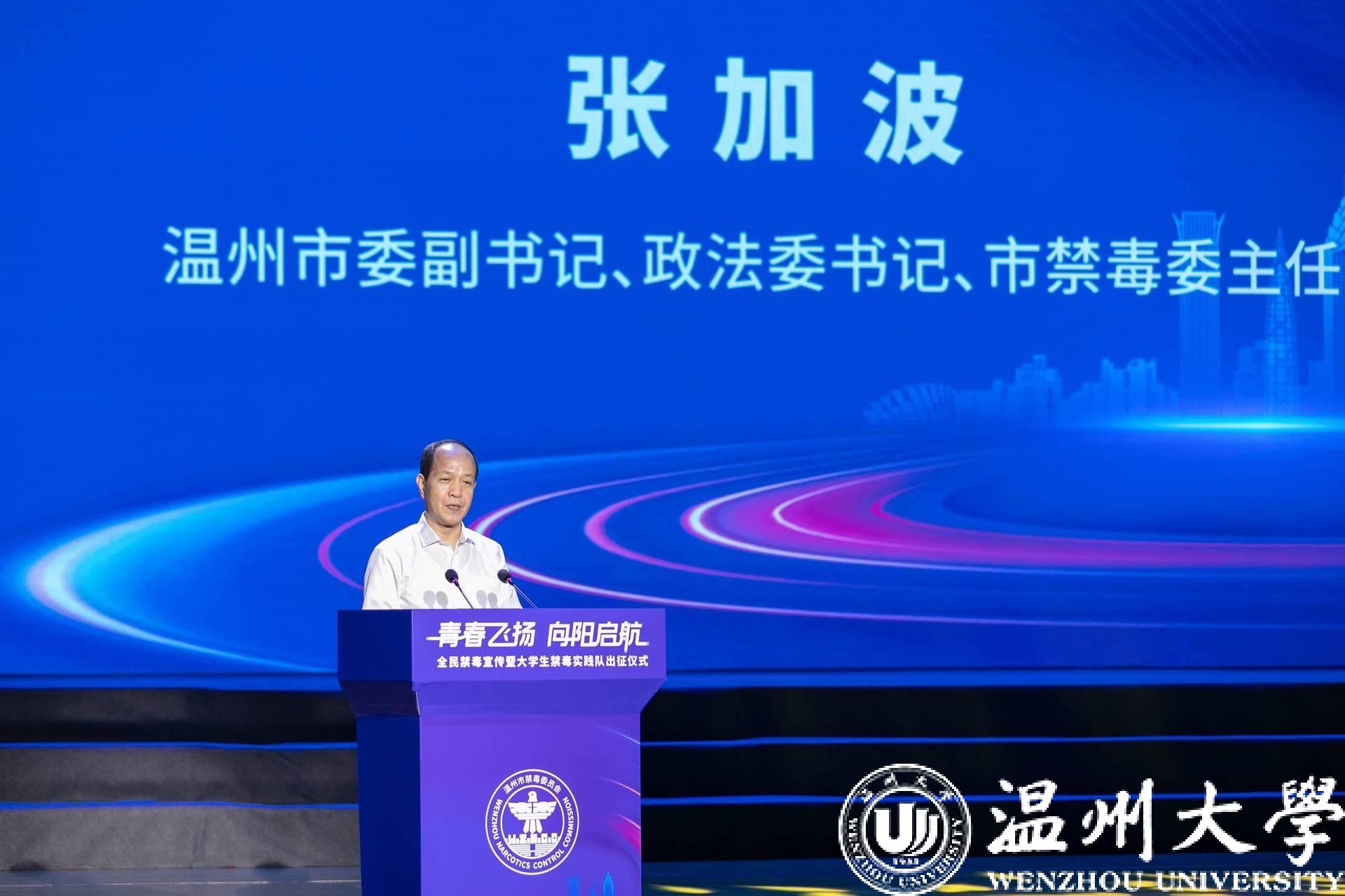张加波讲话,并与毛伟平副市长共同为在温高校大学生禁毒实践队代表授旗。与会领导嘉宾按下启动键,禁毒实践活动正式启动,11所在温高校的禁毒实践队向阳启航,朝着全民禁毒目标奋力出征。