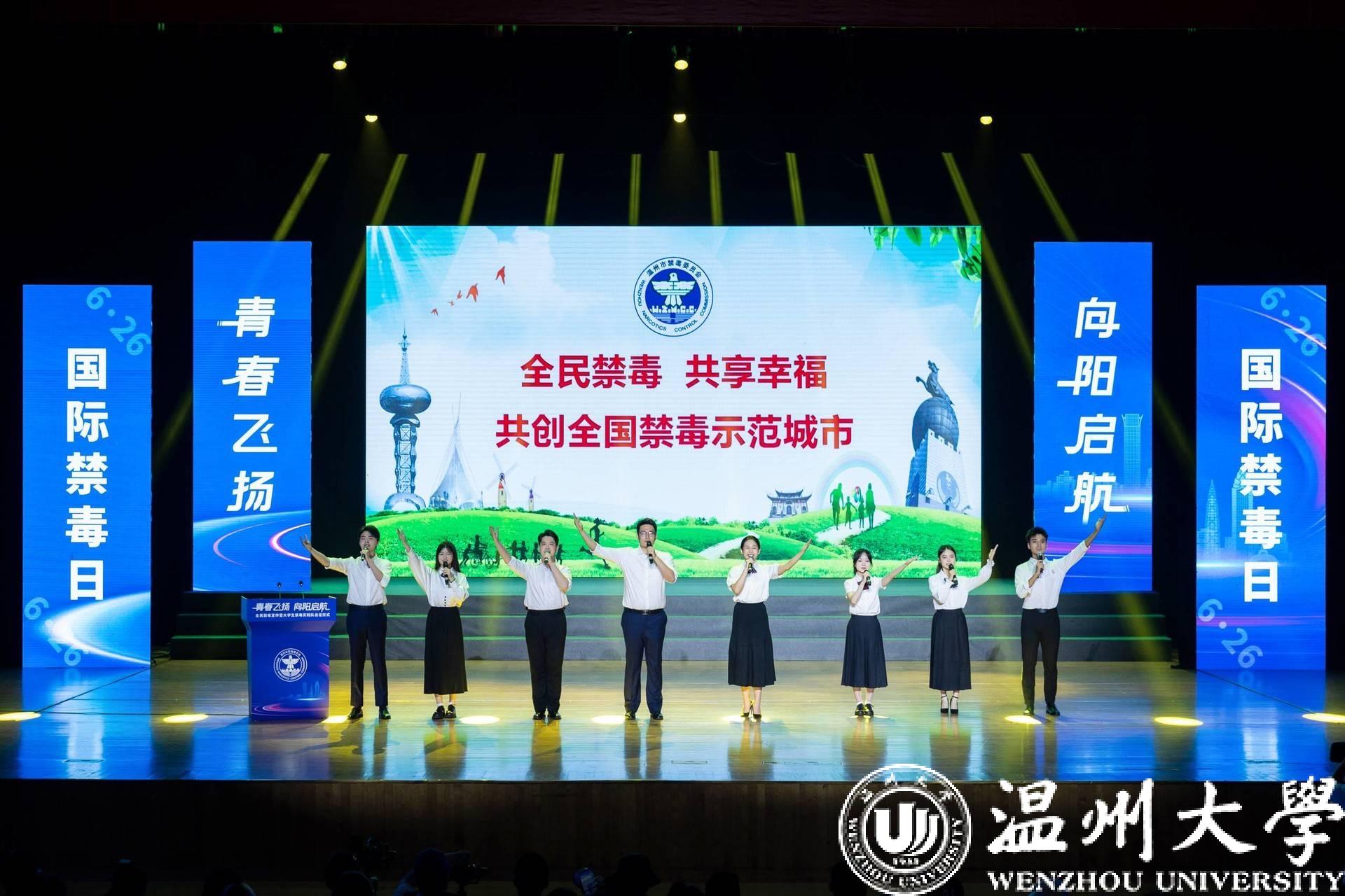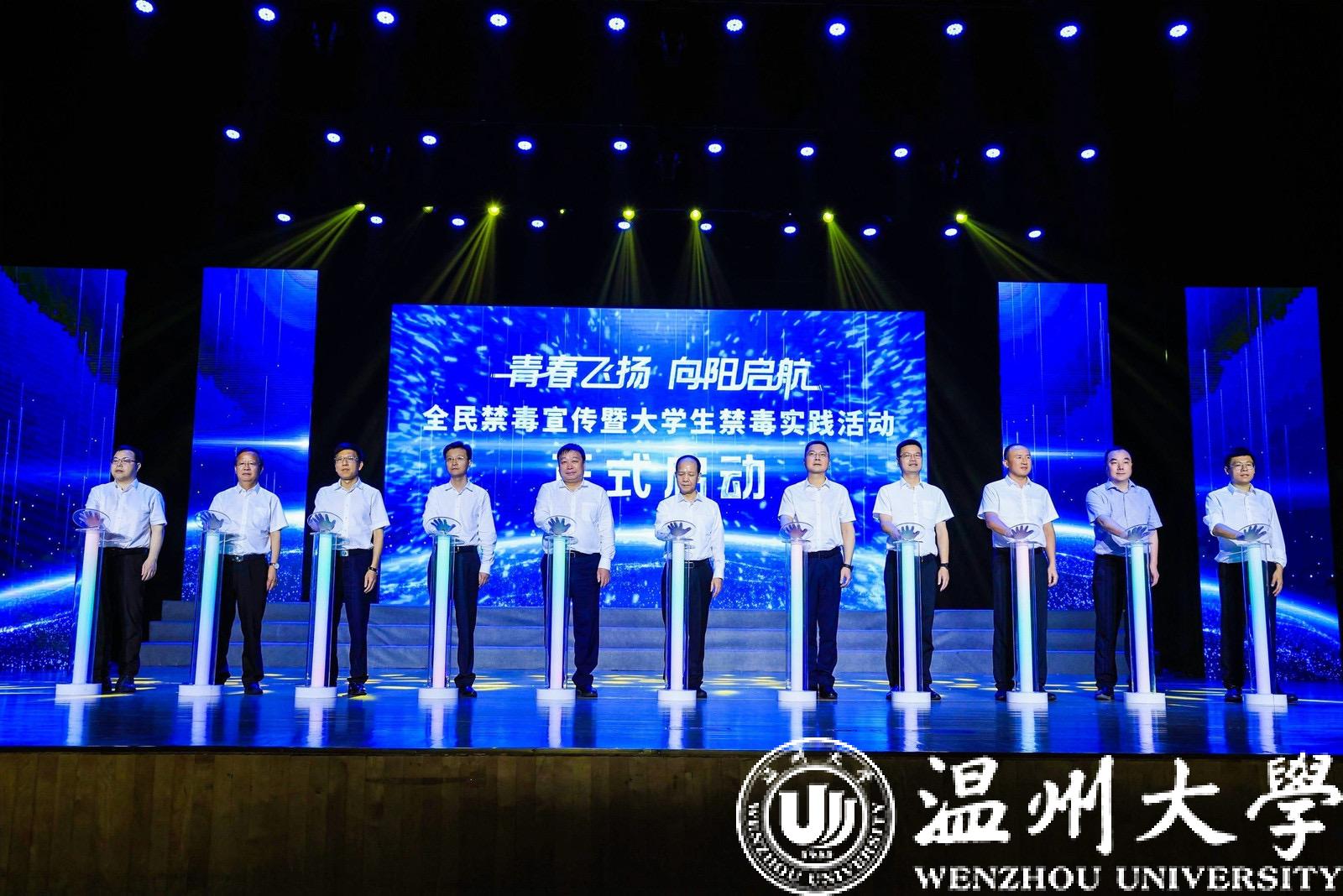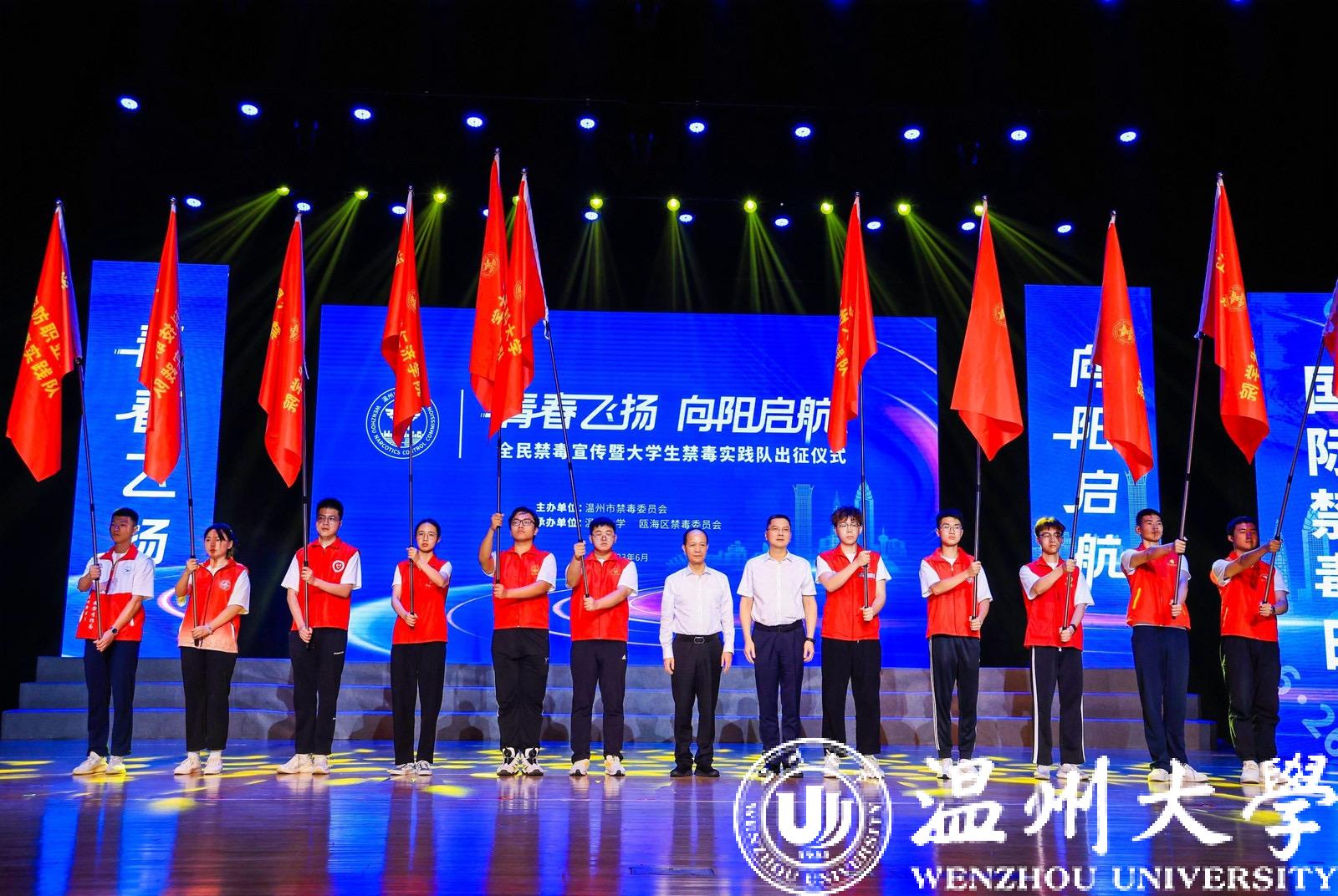 为全面营造全民禁毒宣传月活动氛围,助推温州市“全国禁毒示范城市”创建工作,在第36个“6·26”国际禁毒日来临之际,由温州市禁毒委员会主办,香蕉视频 承办的“青春飞扬 向阳启航”全民禁毒宣传暨大学生禁毒实践队出征仪式和禁毒主题游园会于6月14日下午在香蕉视频 育英大礼堂内、外场地同时举行。市委副书记、政法委书记、市禁毒委主任张加波,副市长、市禁毒委常务副主任、公安局局长毛伟平,校长赵敏等领导出席活动。来自市禁毒委各成员单位代表、各高校实践队师生代表、留学生代表、志愿者、新闻媒体共计600余人参加了本次活动。