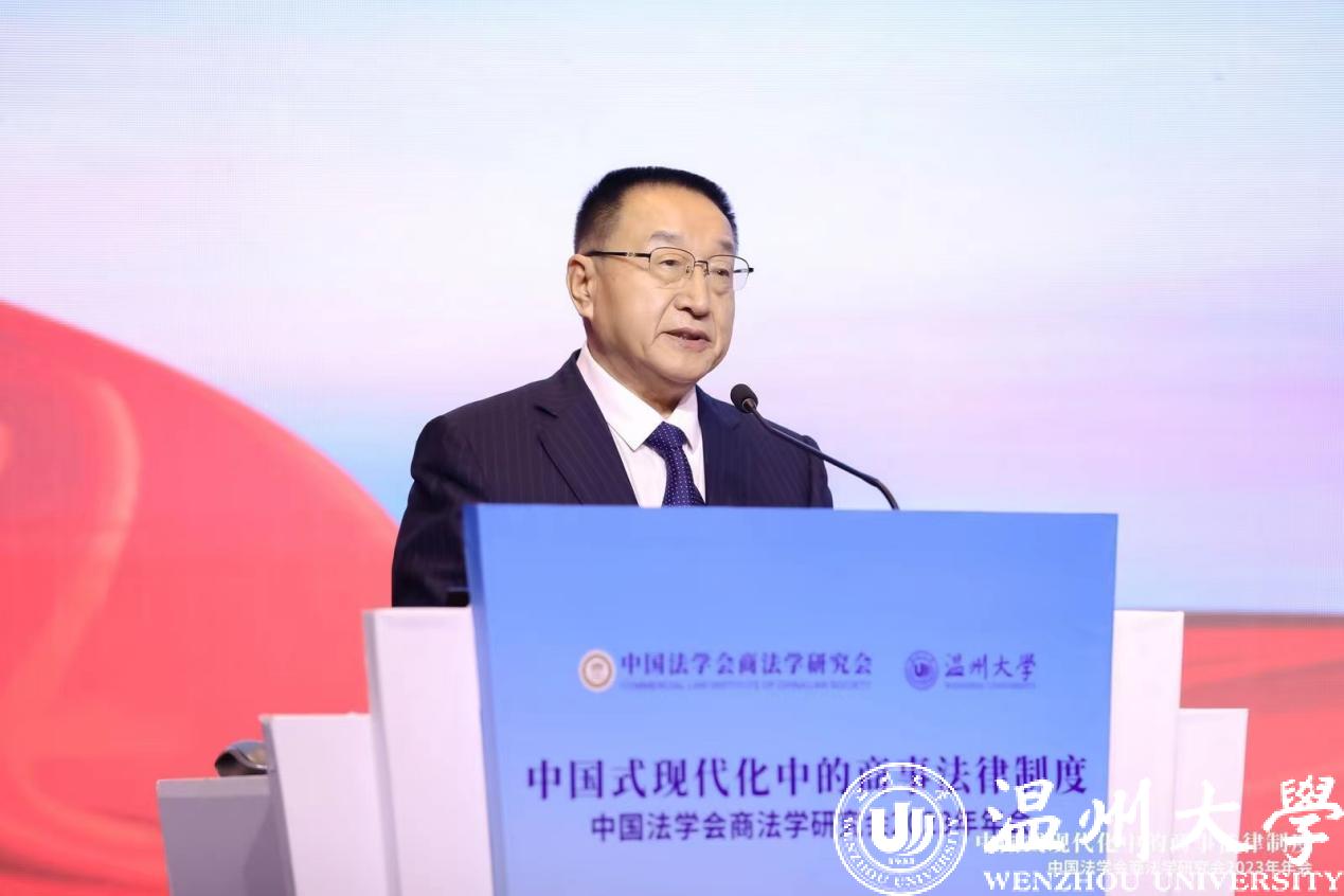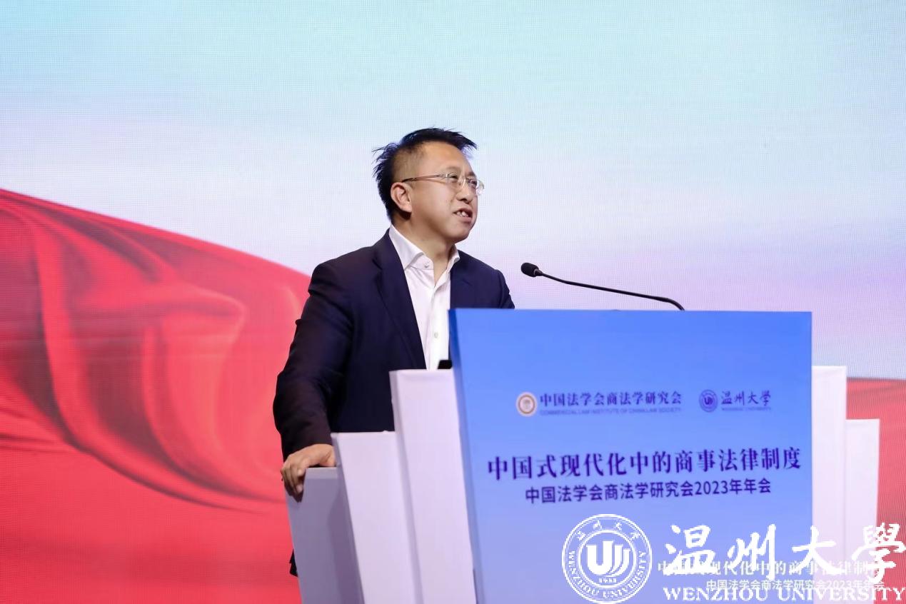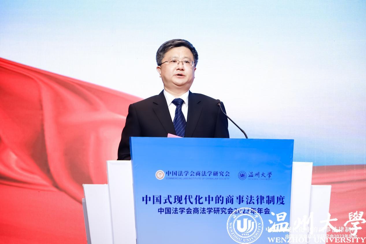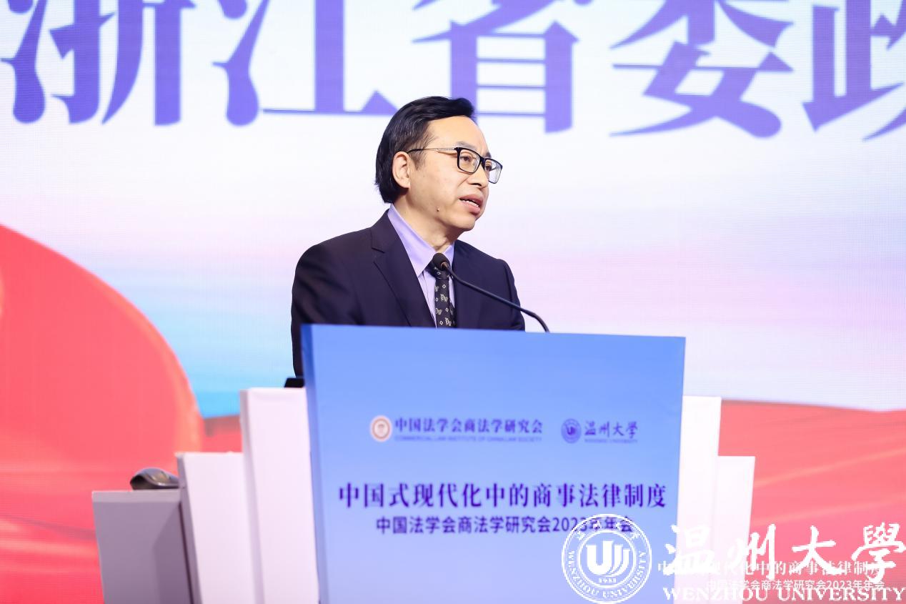 浙江省委政法委一级巡视员,浙江省法学会党组成员、副会长陆剑锋在致辞中指出,实践证明改革开放是决定当代中国命运的关键一招,浙江要在深化改革、扩大开放上续写新篇章,真正激发创新第一动力,不断推进浙江省经济社会繁荣发展和商事活动蓬勃发展。本次年会根据当前公司法修订草案,紧紧围绕党的二十大报告提出的“深化商事制度改革”带来的商事法治命题进行深度交流,对于贯彻落实党的二十大报告精神具有重要意义。他介绍了浙江各级法学会在优化营商环境方面所取得的成果,表示将以此次年会为契机,继续深化商法学理论和实践研究,为加强商事法治建设,服务商事改革提供更多理论支撑。