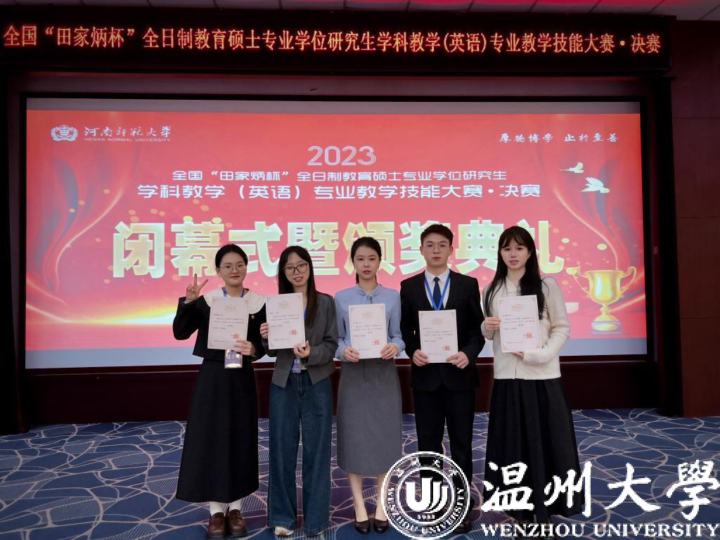 10月21日至22日,2023年“田家炳杯”第五届全国全日制教育硕士专业学位研究生学科教学(英语)专业教学技能大赛决赛在河南师范大学落下帷幕。香蕉视频 外国语学院研究生何柳、金佳乐分别斩获一等奖、吴俐嶙、张玲和郑金敏分别荣获三等奖。王崴然、李宋昊老师获得优秀指导教师的荣誉。本次大赛外国语学院参赛学子获奖率100%,一等奖获奖数量全国第一,获奖人数与总成绩连续两年在全国名列前茅,在获奖数量和质量上均取得喜人佳绩。