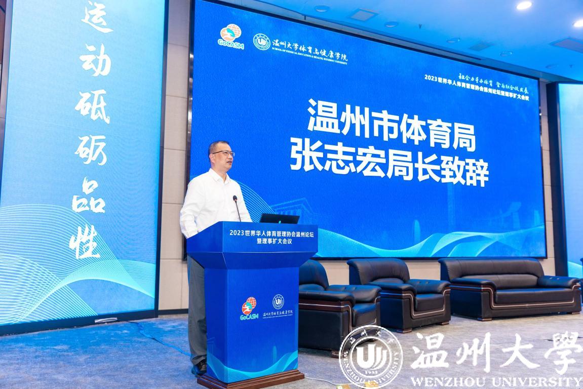 温州市体育局局长张志宏讲话。他指出,温州是中国社会力量办体育的唯一试点,温州市紧抓契机,创造了许多的改革模式,取得了重大的效果,满足了百姓日益增长的体育需求,让体育成为人民美好生活的重要组成。希望借此机会,能更好促进社会力量推动体育事业的发展与人才培养。