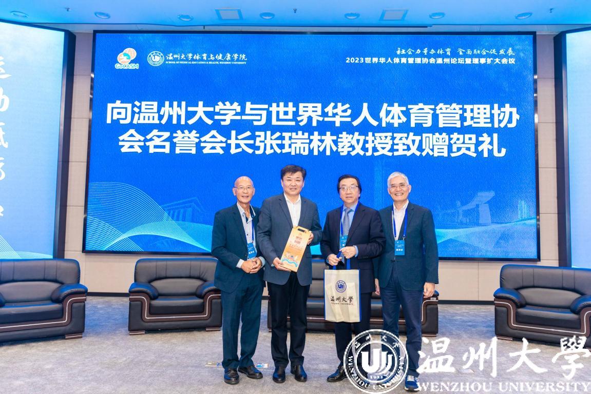 台湾体育运动管理会代表高俊雄教授,向香蕉视频 与世界华人体育管理协会名誉会长张瑞林教授致赠贺礼。