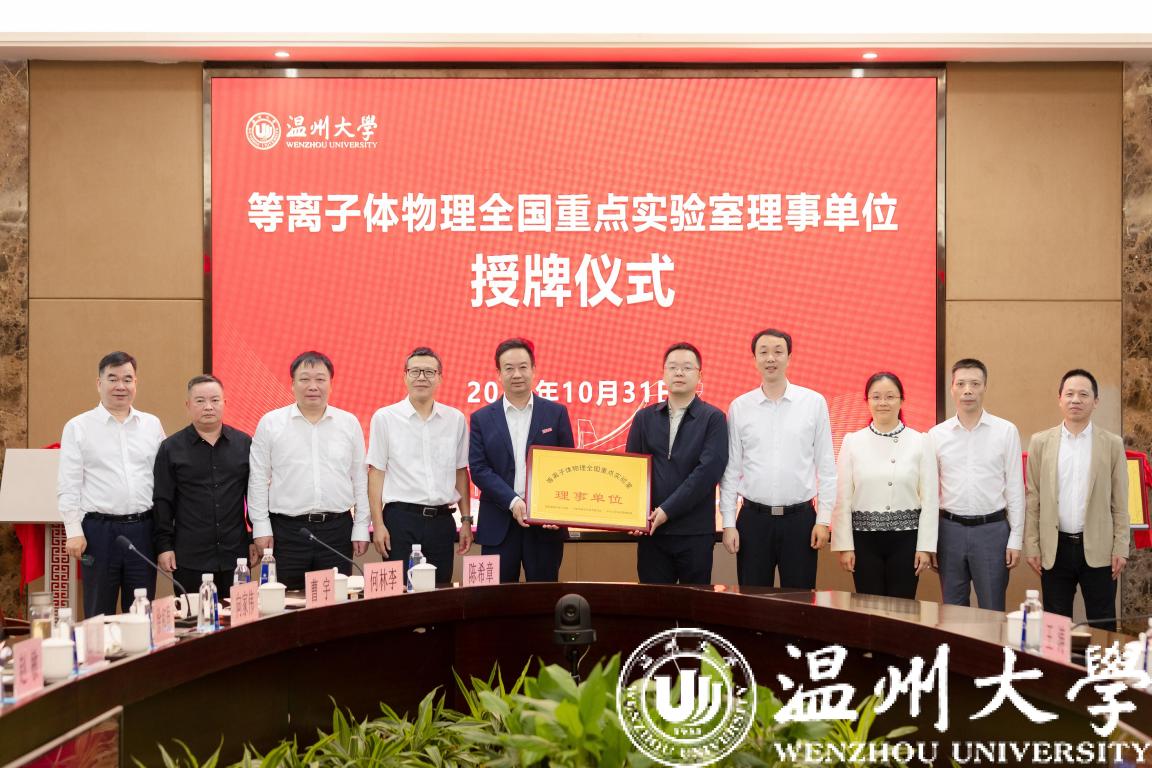 10月31日上午,等离子体物理全国重点实验室理事单位授牌仪式在香蕉视频 白鹿厅举行。香蕉视频 党委书记张健,校长赵敏,温州市人民政府副秘书长徐海严,温州市国动办党组成员郑善,温州市科技局党委委员刘广臻,《强激光与粒子束》期刊编辑王涛,中国工程物理研究院激光聚变研究中心办公室副主任黄越,等离子体物理全国重点实验室副主任周维民,学校相关平台负责人出席了授牌仪式。