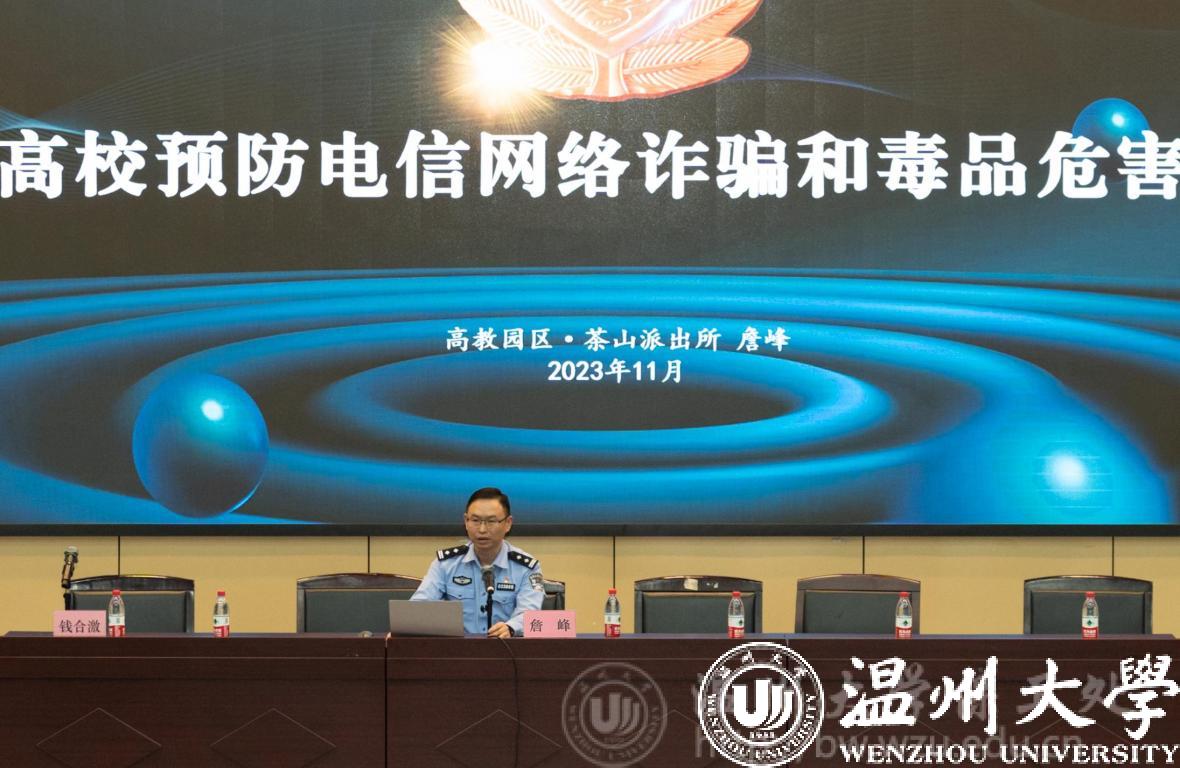高教园区派出所所长詹峰从预防电信网络诈骗和预防毒品危害两个方面进行了精彩的讲解。他向大家科普了毒品种类,并指出了毒品的严重危害性,强调了师生们要树立正确的人生观念,他希望班级安全委员当好反诈、禁毒宣传员,开展形式多样的安全宣传活动,帮助同学们提高反诈和禁毒意识,筑牢安全防线,共同维护平安校园。