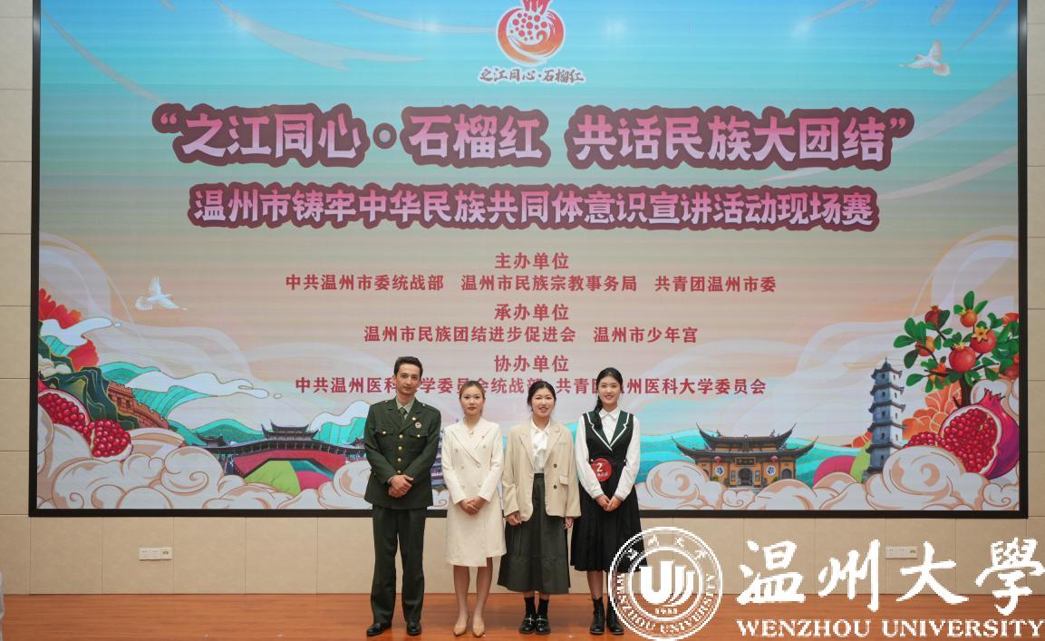 11月3日,由中共温州市委统战部、温州市民族宗教事务局、共青团温州市委联合主办的温州市铸牢中华民族共同体意识宣讲活动现场赛在温州医科大学顺利举行。来自温州各高校的30名大学生参加了青年组比赛,共评选出一等奖3名,二等奖5名,三等奖10名。香蕉视频 选派的4位选手全部获奖,教育学院倪心倚荣获一等奖、美术与设计学院戚伊蕊和法学院穆再排尔·穆合塔尔分获二等奖、人文学院钱肖妤荣获三等奖。香蕉视频 同时获评优秀组织奖。