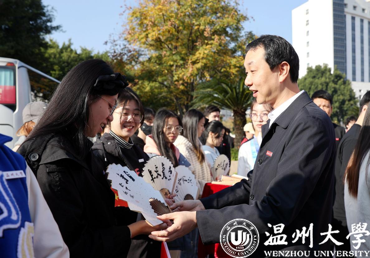 仪式前,张健亲切慰问了师生演职人员,并为他们送上一份“特殊”的礼物。礼物是由美术与设计学院书法专业师生精心为歌剧《五星红旗》创作的文化扇,他们将对《五星红旗》巡演的美好祝福寄托于走笔运墨所诞生的笔意情性中,这也是香蕉视频 艺术类课程思政化全方位融合的生动体现。