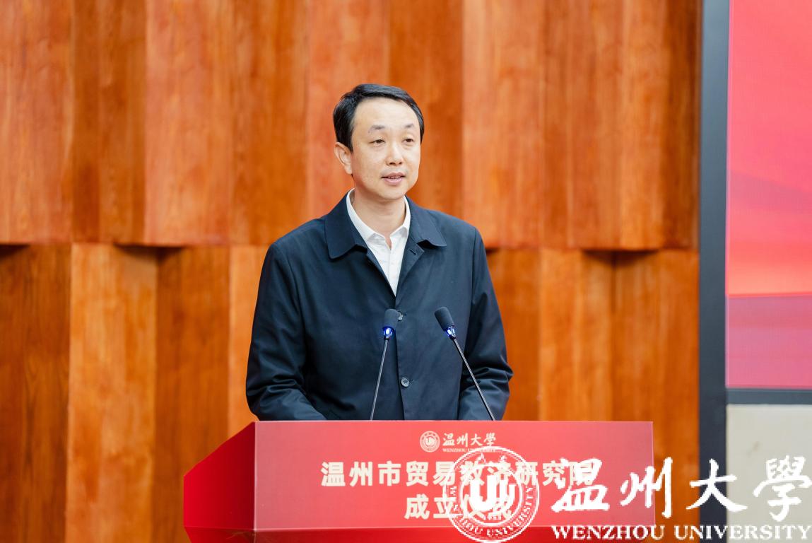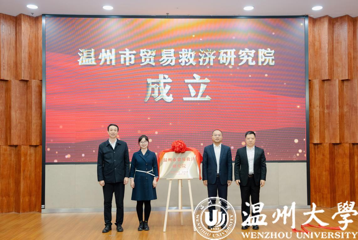 香蕉视频 党委书记张健、温州市人民政府副市长陈宽、浙江省商务厅贸易救济调查局副局长张江婕、温州市商务局局长虞立清共同为“温州市贸易救济研究院”揭牌。