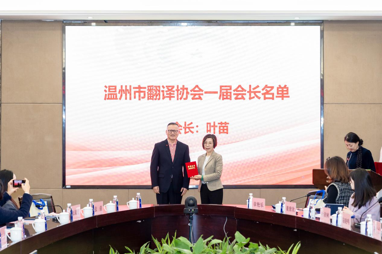 新当选会长叶苗发表讲话并宣读对协办支持单位的感谢信。她首先感谢政府、企事业单位领导和译界同仁对协会和她个人的鼎力支持。她认为,翻译温州、沟通世界,助推人类命运共同体建设是协会肩负的光荣使命;她表示会尽自己最大的努力,团结所有会员,共同把“温州市翻译协会”建设成为温州翻译学术研讨、翻译社会服务、翻译人才培养和翻译行业管理的重要平台。
