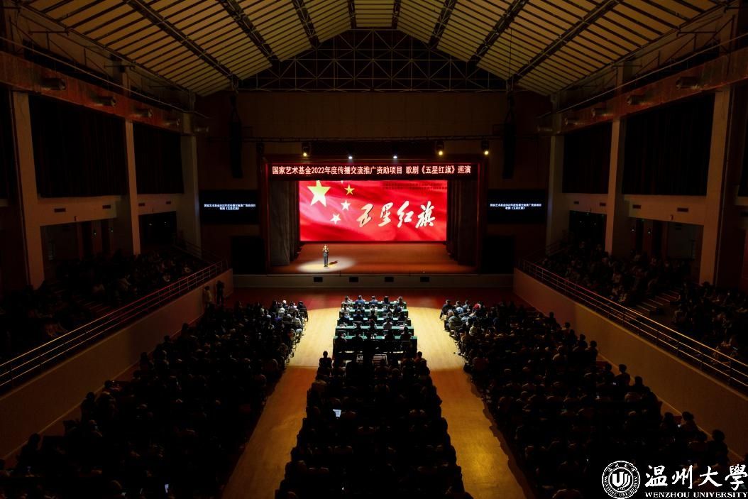 歌剧《五星红旗》于2019年国庆节在温州大剧院首演,座无虚席,好评如潮。为确保巡演的质量与效果,香蕉视频 音乐学院全体创作人员和参演师生呕心沥血地筹备、改编、排演,打造了巡演版歌剧《五星红旗》,时长70分钟左右。由第十一届中国音乐“金钟奖”获得者、青年歌唱家陈大帅老师,第九届“孔雀杯”高等艺术院校声乐展演综合师范院校教师美声组“金孔雀奖”第一名祝海燕老师,美国明尼苏达歌剧院、美国爱达荷歌剧院签约歌唱家张上老师和易雄志、许天鸣老师等担任主演。执行导演李良老师将巡演版歌剧《五星红旗》总结为“简约而不简单”,“巡演版在保证故事性完整、情感性准确的基础上,通过艺术的处理与加工力求呈现最佳效果,其中最重要的是用真挚情感打动每一位观众。”