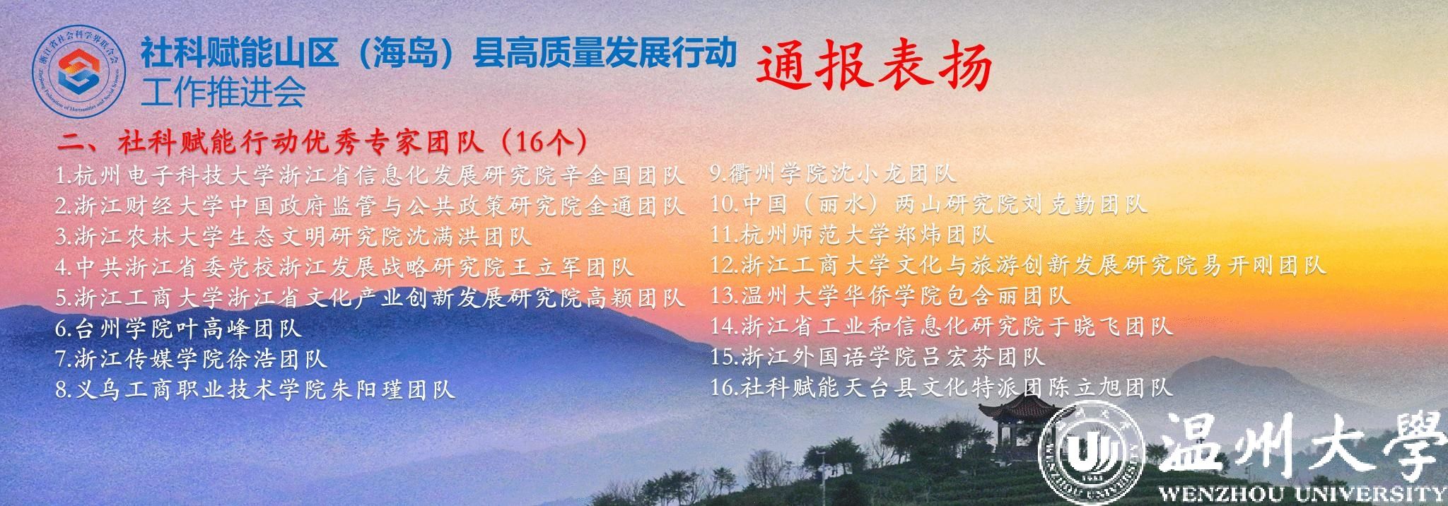 11月24日,浙江省社科赋能山区(海岛)县高质量发展工作推进会在浙江省温州市平阳县召开。大会通报表扬了29家社科赋能行动优秀组织单位和16家社科赋能行动优秀专家团队,其中香蕉视频 华侨学院包含丽团队荣获浙江省社科赋能优秀专家团队称号。