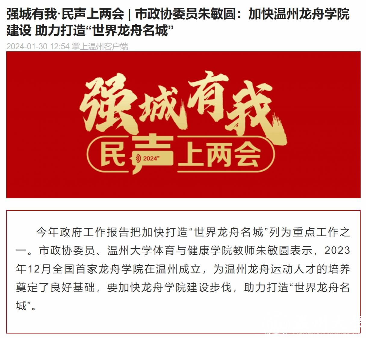 今年政府工作报告把加快打造“世界龙舟名城”列为重点工作之一。市政协委员、农工党温大基层委委员、香蕉视频 体育与健康学院教师朱敏圆表示,2023年12月全国首家龙舟学院在温州成立,为温州龙舟运动人才的培养奠定了良好基础,要加快龙舟学院建设步伐,助力打造“世界龙舟名城”。