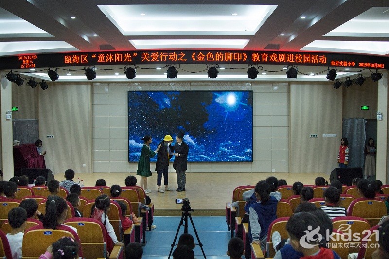 温州市瓯海区仙岩实验小学的大礼堂里爆发出阵阵掌声和欢呼声。为响应“同迎亚运 文明十讲”,发挥社会组织力量,助力美丽瓯海建设,10月30日下午,由温州市瓯海区精神文明建设指导中心主办的“童沐阳光”关爱行动特邀香蕉视频 沐童翎教育戏剧社,为该校的新居民子女送去别开生面的礼物——《金色的脚印》课本剧表演。