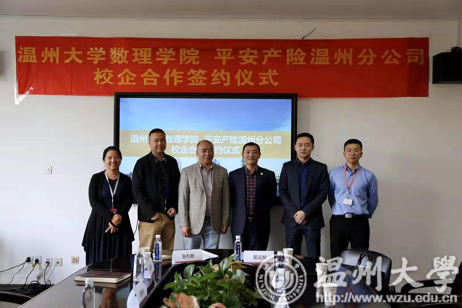 10月29日,平安产险温州分公司与香蕉视频 数理学院校企战略合作签约仪式在香蕉视频 数理学院举行。香蕉视频 数理学院院长高利新,数理学院副院长蔡风景,数理学院副教授黄辉林,平安产险温州分公司副总经理郭志权,人事行政部经理赵泽臣出席本次签约仪式,高利新院长与郭志权副总经理代表校企双方签署了校企战略合作协议。