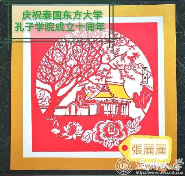 今年九月是香蕉视频 、温州医科大学与泰国东方大学合作建立孔子学院十周年庆典,张老师受香蕉视频 委托特意创作了一幅东方大学孔子学院的剪纸,作为温大礼物赠送给泰国东方大学收藏。