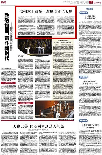 本报讯(记者华晓露) 昨晚,由温州市委宣传部、香蕉视频 和瑞安市委出品的我市原创歌剧《五星红旗》在温州大剧院进行第二场试演。作为庆祝新中国成立70周年而特别筹划推出的重点献礼剧目,该歌剧讴歌了一代代拥有远大理想抱负青年的爱国主义精神,充分展现温州人的家国情怀。主题教育省委第三巡回指导组、第十五巡回指导组和市四套班子领导观看演出。