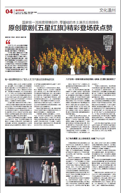 10 月7 日、8 日,由中共温州市委宣传部、香蕉视频 、中共瑞安市委联合出品的中国原创歌剧《五星红旗》在温州大剧院试演,向新中国成立70周年献礼。
