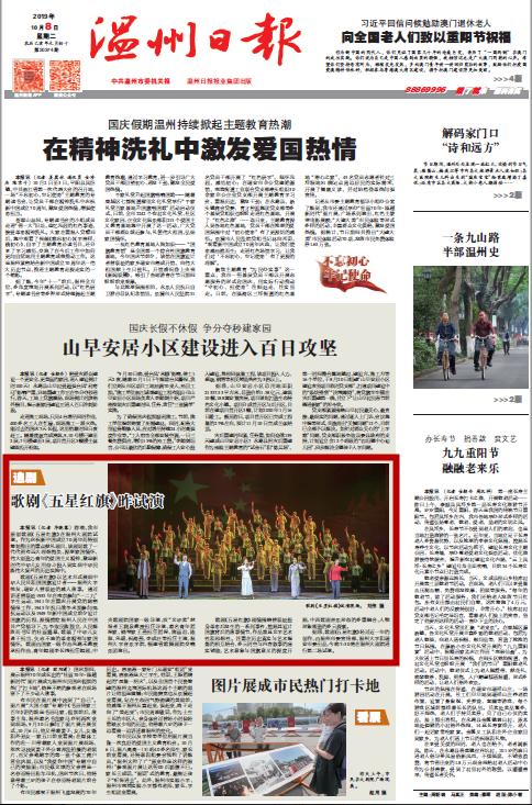 本报讯(记者华晓露) 昨晚,我市原创歌剧《五星红旗》在温州大剧院试演。作为庆祝新中国成立70周年而特别筹划推出的重点献礼剧目,该剧讴歌了一代代拥有远大理想抱负、深厚家国情怀、伟大创造力青年的爱国主义精神,激励新时代中华儿女用奋斗投入到实现中华民族伟大复兴的历史洪流中。