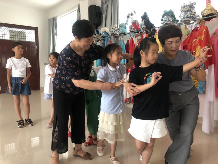 与西方文化不同的是,在杏湾文化礼堂里,传授的是中国传统文化越剧。随着吴建松有节奏的击打声,10余个孩子踩着鼓点走在舞台上,一整套动作完成后,站在一旁的吴微芬和赵荷媚看到几个孩子的动作并不规范,又上前纠正。