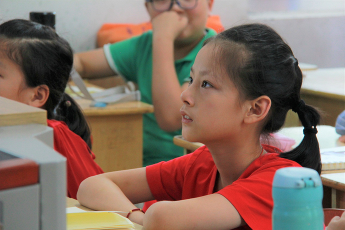 青韵队员汤晓栋在上课时给孩子们普及关于苏步青的经历,苏步青出身贫寒,在中学校长的资助下远渡日本留学,在异乡获得诸多荣誉后,毅然回国,投入祖国教育事业的建设,无怨无悔。小孩子们对苏步青老先生的爱国故事入了迷,期间也有不少问题冒出来,在汤老师讲述完后,纷纷举手询问,为什么苏步青老先生已经享誉国际的时候,还要回到祖国。