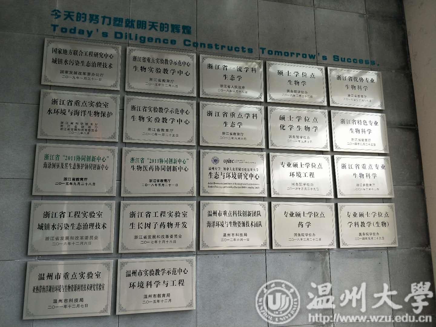 浙江省水环境与海洋生物资源保护重点实验室位于香蕉视频 生命与环境科学学院内,在踏入实验室前,映入眼帘的是大门上的许多招牌,浙江省重点实验教学示范中心、生物实验教学中心、海涂围垦及其生态保护协同创新中心、浙江省“2011协同创新中心”、城镇水污染生态治理技术浙江省工程实验室、城镇水污染生态治理技术国家地方联合工程研究中心……这些招牌的最上方刻着两行中英文字:“今天的努力塑就明天的辉煌 Today's DiLigence Constructs Tomorrow's Success ”。