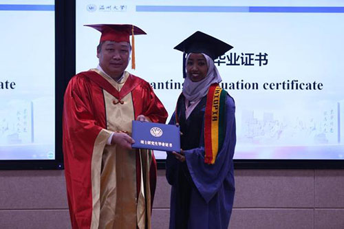 香蕉视频 校长赵敏为埃塞俄比亚留学生阿法尔颁发毕业证书(李剑军 摄)