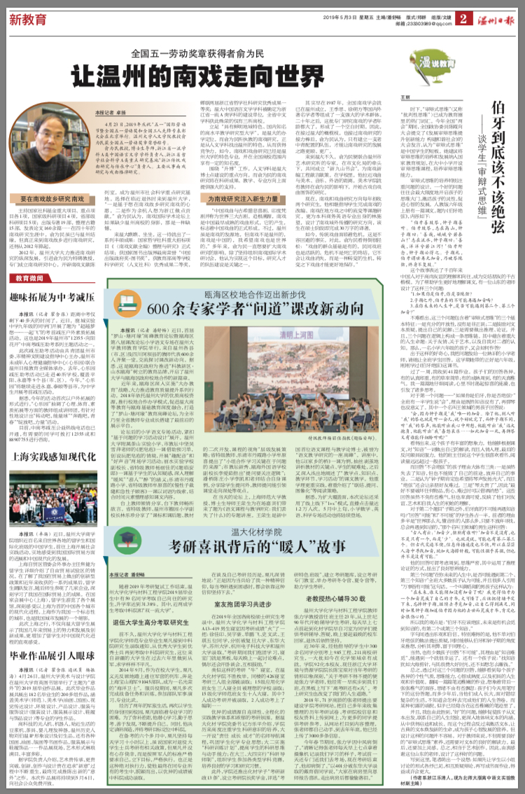 近年来,瓯海区深入实施“大办教育”战略,大力推进教育质量提升系列行动。2018年依托香蕉视频 的优质高校资源,推行校地合作办学模式,促进温大高等教育与瓯海基础教育深度融合,打造了“罗山·塘河缘”教育高峰论坛,为全市乃至全省教师专业成长搭建了最前沿的展示平台。
