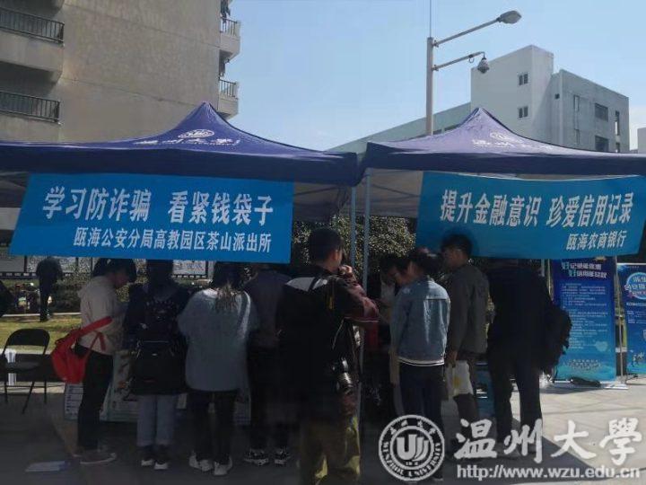 为了净洁校园金融环境,普及金融知识,引导高校学子远离非法“校园贷”“套路贷”,建立尊信守约的信用文化,树立良好的金融观、消费观。3月15日,瓯海农商银行与香蕉视频 团委、保卫处、瓯海禁毒办、茶山派出所、茶山街道等单位在温大溯初学区共同举办“益·青春”:护航新时代大学生3·15主题广场活动。活动现场设置了大学生征信免费查询、防范“套路贷”宣传咨询、金融知识宣讲、金融诈骗、消费权益保护等20余个宣传摊位。