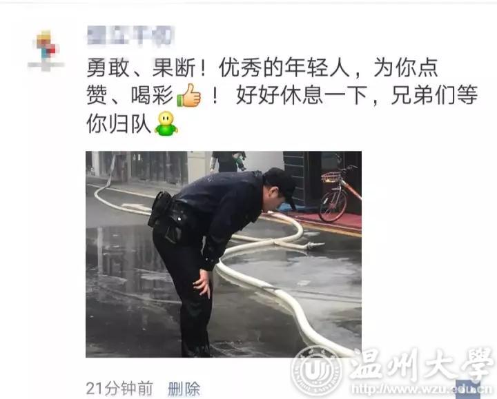12月21日,温州市公安局瓯海区分局瞿溪派出所教导员叶长稳在微信朋友圈发布的一张照片,牵动着全局所有同事的心。图片中,一位民警衣服裤子湿透,半俯身用双手强撑着膝盖。而就在现场人员拍下这张照片的前几分钟,他刚刚完成了从灭火到转移毒气瓶的一组漂亮动作。随后,他因吸入过多乙炔有毒气体被紧急送进了抢救室。