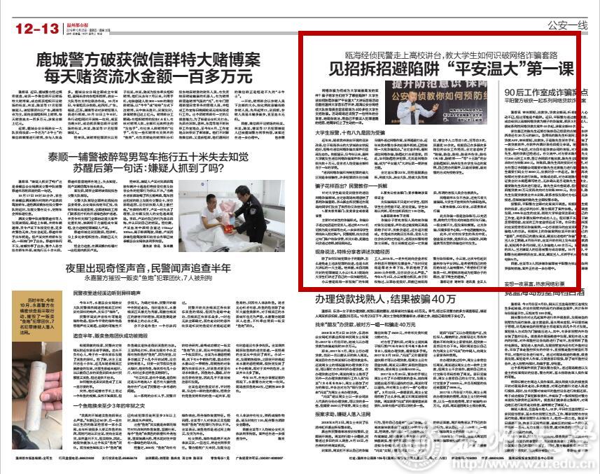 “通讯网络诈骗和传统犯罪的最大区别是非接触性,许多犯罪团伙往往藏身境外通过网络作案,妄图逃避打击,近年来我市警方多次赴境外抓捕,已经摧毁一大批诈骗窝点。”金定忠介绍,遏制通信网络诈骗,防范比打击更重要。因此,如何防范经济犯罪,尤其是网络诈骗,成为“平安温大”大讲坛第一期讲座主题。