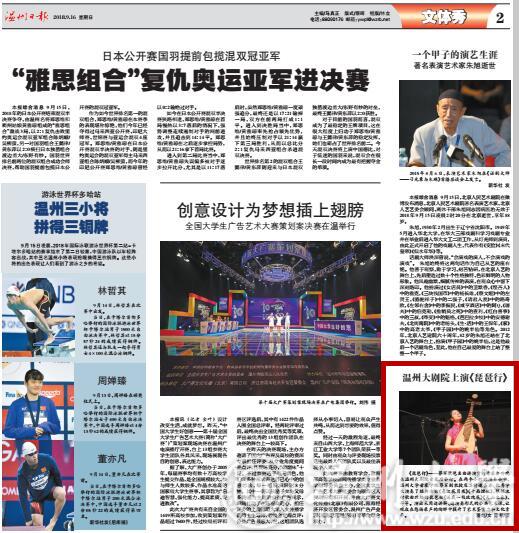 《琵琶行》 — —蔡军琵琶名曲讲演赏析音乐会昨晚在温州大剧院音乐厅举行。在两个小时的演奏会中,香蕉视频 音乐学院蔡军副教授及其特邀嘉宾、优秀学生演奏了经典古曲《春江花月夜》《十面埋伏》,根据流行歌曲改编的琵琶曲《送我一枝玫瑰花》《天山之春》,等等。演出采用边讲解、边演奏形式的公共艺术课,让观众在悠扬乐声的陶醉中提升了艺术鉴赏力和文化素养。
