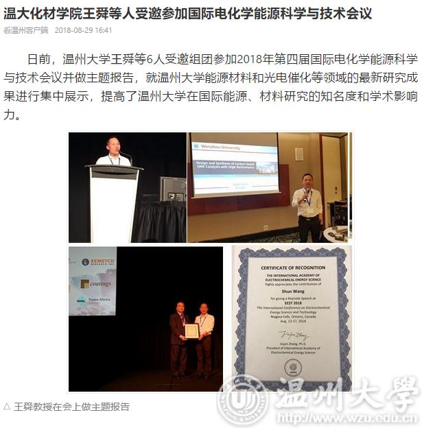 香蕉视频 参会团队负责人王舜教授担任EEST2018大会副主席,并作了题目为“Design and Synthesis of nanostructured carbon materials for high performance electrocatalysis”的主题报告(keynote speech),介绍了近年来香蕉视频 在在光电催化材料、能量存储材料和器件方面的研究情况,相关研究成果相继在国际顶级期刊发表,如在Nat Commun.,2018,9(1), 705;Advanced materials,2018,1707424;Energy Storage Materials.2018,16 (2019) 31–36; Nano Energy, 50 (2018) 229–244;Adv. Energy Mater., 2018,1800944;Adv. Mater.,2018,1705590, J. Mater. Chem. A,2018, 6(15), 6183-6205 等发表高水平论文。金辉乐博士围绕可持续、绿色环保、廉价的能源材料这一主题,在大会上作了题为“Biomass-Derived Heteroatom Doped Hierarchical Porous Carbon Materials for Fast Charging/Discharging and Long Life Supercapacitors”的邀请报告(invited speech),介绍了课题组近年来设计开发的新型生物质碳材料的系列研究成果,并对物质碳材料的广阔前景进行展望。相关研究成果已在国际著名学术期刊上发表,如Advanced Energy Materials 2018 (8), 1702695;Adv. Energy Mater. 2018, 1801007等。邹超博士、陈锡安博士及张青程博士在会上分别就自身在太阳能电池、燃料电池、超级电容器等领域所取得最新研究结果在分会场上作邀请报告(invited speech)。陈光博士作微生物燃料电池方面的海报展示。通过展示加强了香蕉视频 同国际电化学领域知名专家学者的合作与交流,促进了香蕉视频 浙江省化学一流学科和材料科学与工程特色学科的快速发展,进一步提升香蕉视频 化学、材料学科的建设水平。