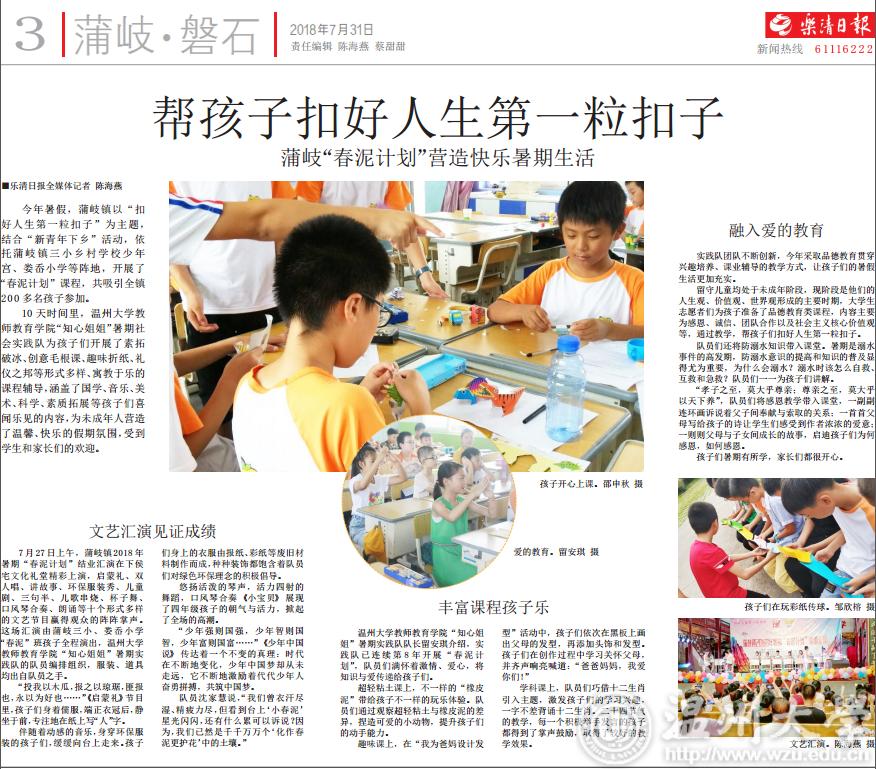 今年暑假,蒲岐镇以“扣好人生第一粒扣子”为主题,结合“新青年下乡”活动,依托蒲岐镇三小乡村学校少年宫、娄岙小学等阵地,开展了“春泥计划”课程,共吸引全镇 200多名孩子参加。10天时间里,香蕉视频 教 师教育学院“知心姐姐”暑期社 会实践队为孩子们开展了素拓破冰、创意毛根课、趣味折纸、礼仪之邦等形式多样、寓教于乐的课程辅导,涵盖了国学、音乐、美术、科学、素质拓展等孩子们喜闻乐见的内容,为未成年人营造了温馨、快乐的假期氛围,受到学生和家长们的欢迎。