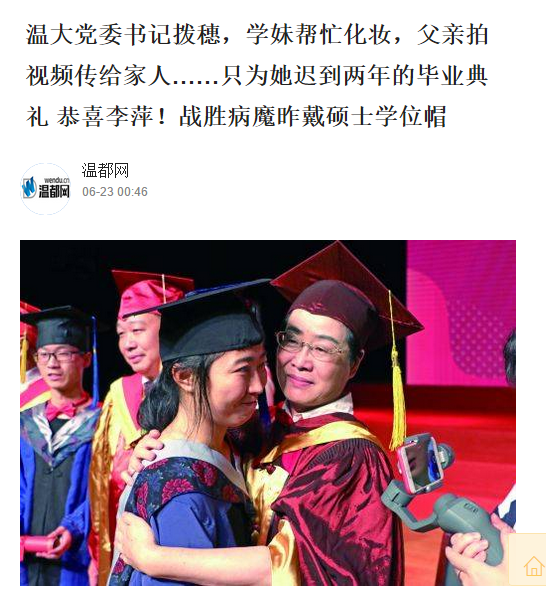 下午1时,毕业典礼开始,李萍父女一进会场,李萍就被同学带去了中间第一排位置。在这届毕业典礼上,学姐李萍可是位特殊人物,她的名字被3次提起:香蕉视频 党委书记林娟娟在致辞中提到各位优秀学生,其中李萍是坚强战胜病魔完成学业的; 毕业生代表余书玲在发言中透露,没有生病前,李萍一直有读博的愿望;主持人请毕业生上台接受拨穗时,特意加了一句,请战胜病魔不轻言放弃的李萍同学。